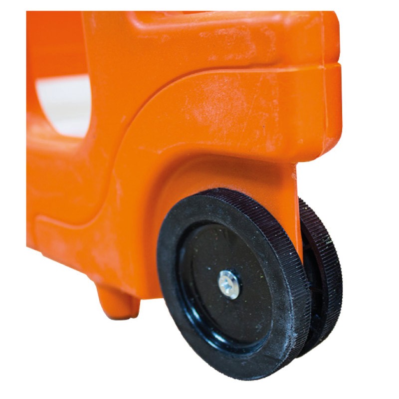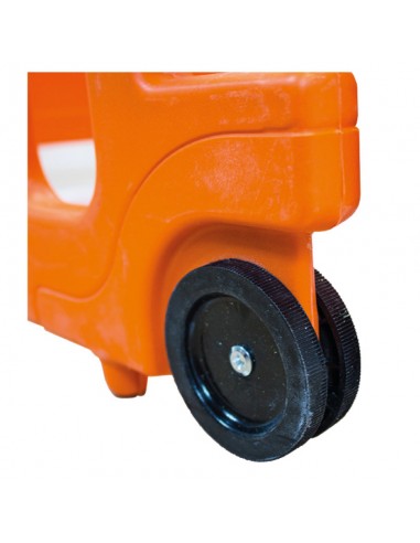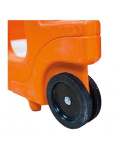 una de sus caras. Cuenta con ruedas a